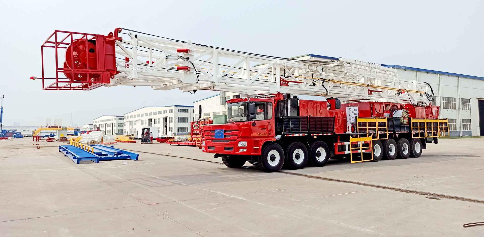 拖裝鉆機(jī)的動(dòng)力、絞車、井架、游車系統(tǒng)及傳動(dòng)機(jī)構(gòu)全部裝載于半掛底盤上,移運(yùn)時(shí)用牽引車拖掛移運(yùn)至現(xiàn)場(chǎng),該類產(chǎn)品對(duì)于提高鉆井作業(yè)搬遷效率具有很大的優(yōu)勢(shì),適應(yīng)于中淺井鉆井作業(yè)。